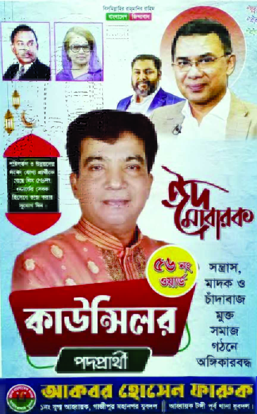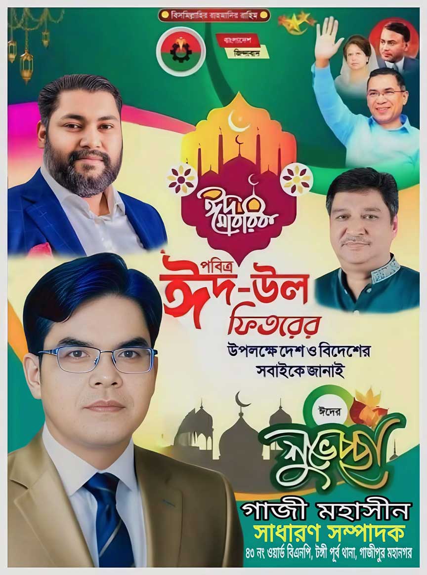 পবিত্র ঈদুল ফিতরের আনন্দঘন মুহূর্তে টঙ্গী পূর্ব থানা অন্তর্গত ৪৩নং ওয়ার্ডের সর্বস্তরের জনগণের প্রতি আন্তরিক শুভেচ্ছা ও অভিনন্দন জানিয়েছেন ৪৩নং ওয়ার্ড বিএনপির সাধারণ সম্পাদক গাজী মহাসীন