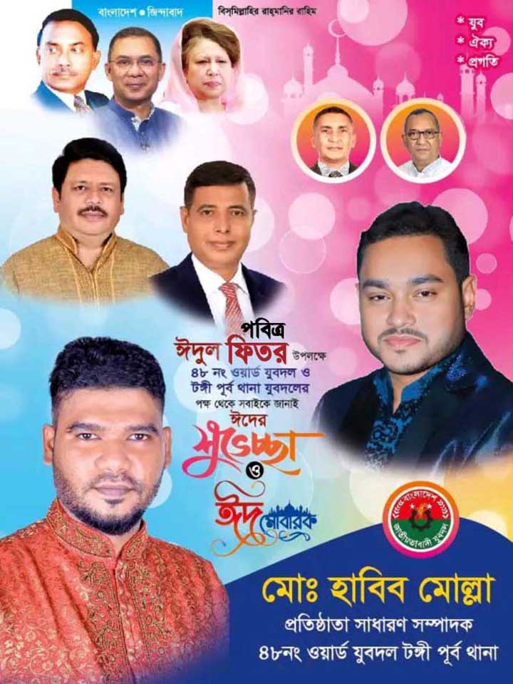 পবিত্র ঈদুল ফিতর উপলক্ষে গাজীপুর মহানগরের টঙ্গী পূর্ব থানা এলাকার ৪৮নং ওয়ার্ড যুবদলের সাধারণ সম্পাদক মোঃ হাবিব মোল্লা আন্তরিক শুভেচ্ছা