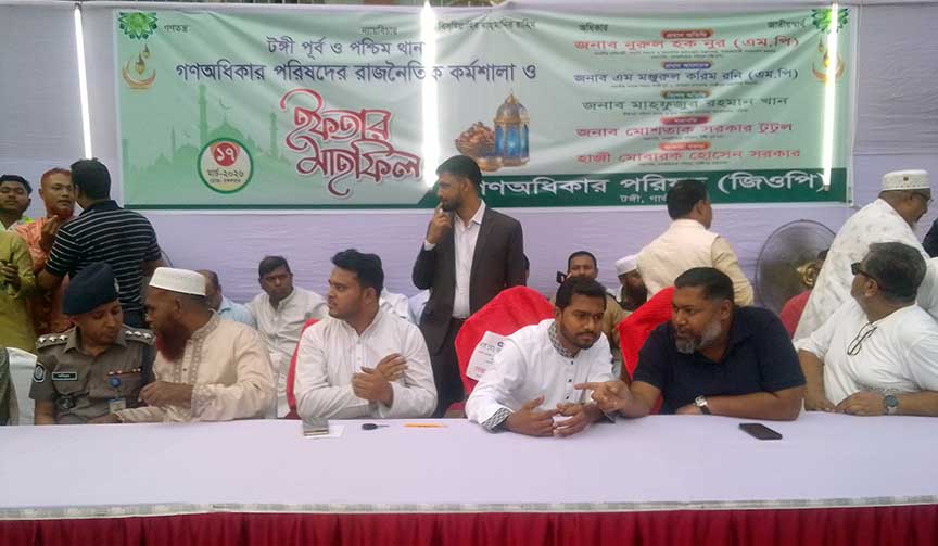 গাজীপুরের টঙ্গী পূর্ব ও পশ্চিম থানার উদ্যোগে গণঅধিকার পরিষদ (জিওপি) আয়োজিত রাজনৈতিক কর্মশালা ও ইফতার মাহফিল অনুষ্ঠিত হয়েছে। মঙ্গলবার সন্ধ্যায়